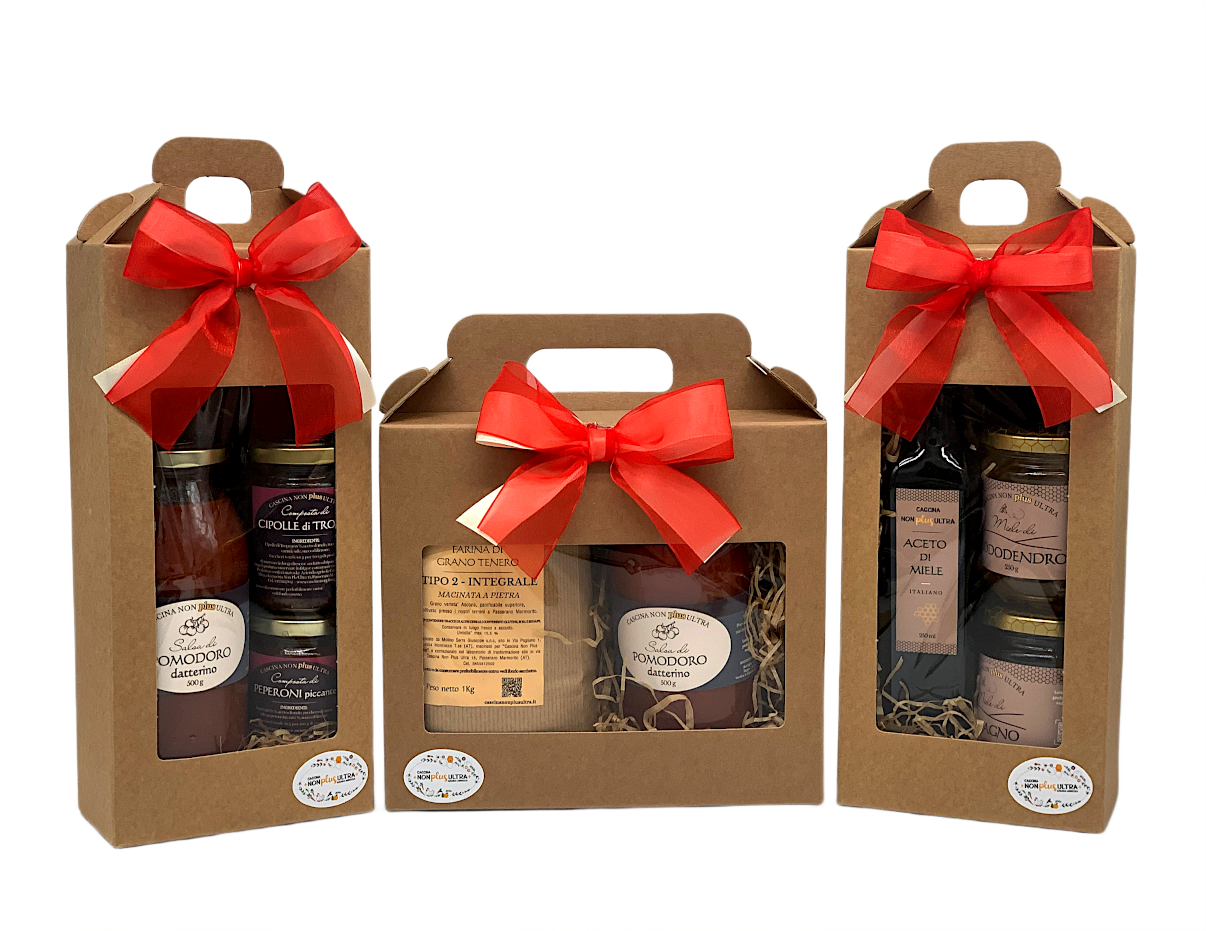 Componiamo per voi splendidi cesti da regalo in 3 diverse dimensioni, piccoli, medi e grandi. In più il contentuto all'interno può essere ampiamente personalizzato per venire incontro alle esigenze di ognuno. Confetture, miele o altri trasformati, ciascuno dei nostri prodotti può essere scelto per comporre il vostro cesto ideale.