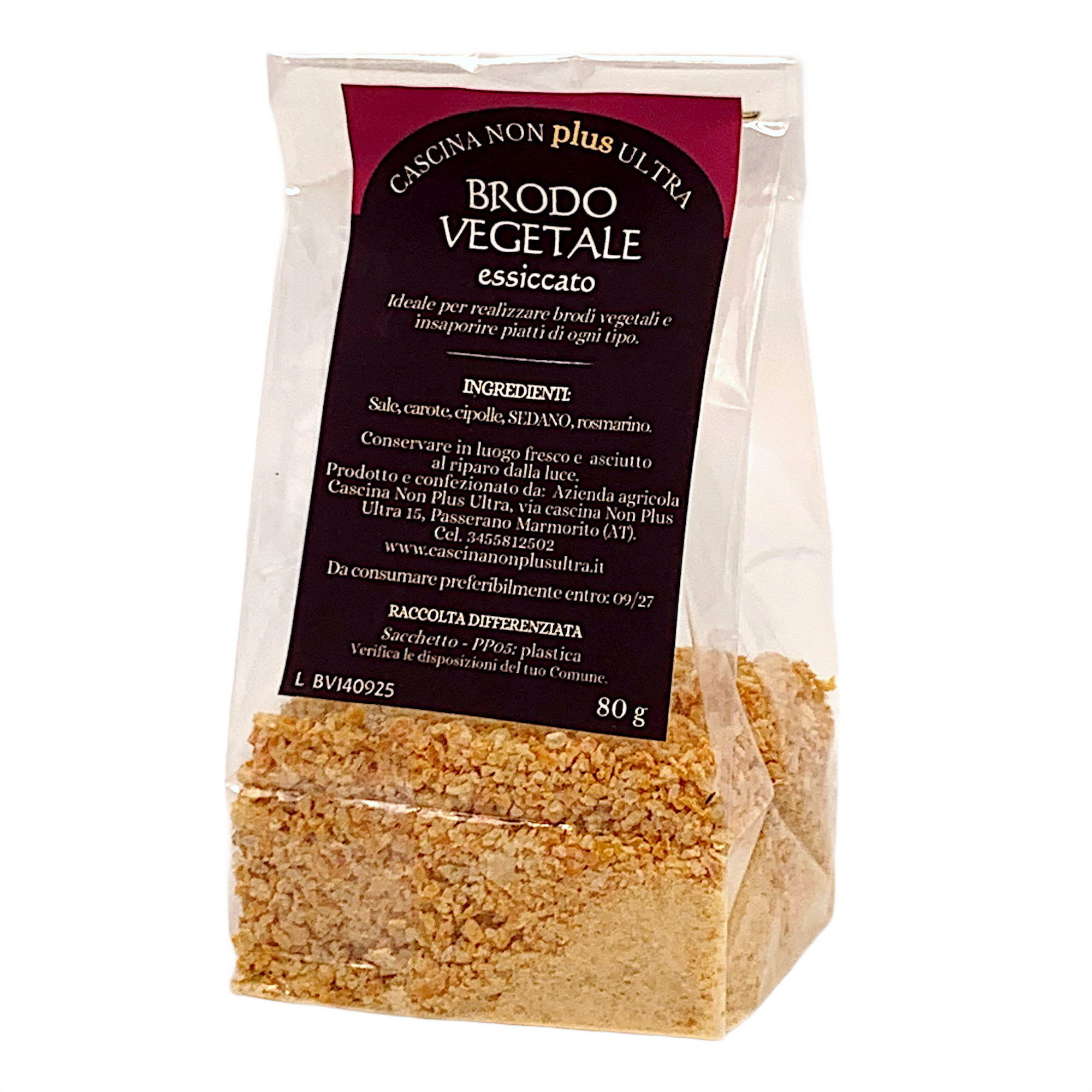 Ideale per preparare brodi vegetali e insaporire in modo semplice, veloce e in questo caso totalmente naturale, qualsiasi tipo di alimento tra cui sughi, arrosti e svariate altre preparazioni in cucina. Contiene carote, cipolle, sedano, rosmarino e sale; quest’ultimo oltre a dare sapidità permette una lunga conservazione fino a 2 anni.