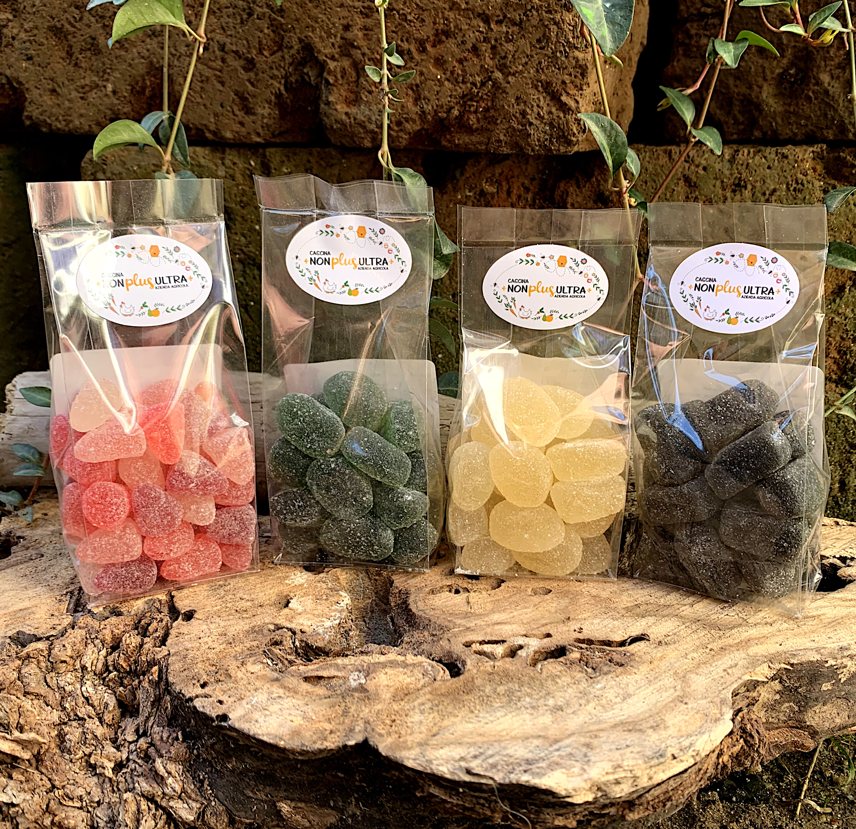 Formati da 100 g e gusti sucai, frutti di bosco, zenzero e pino.